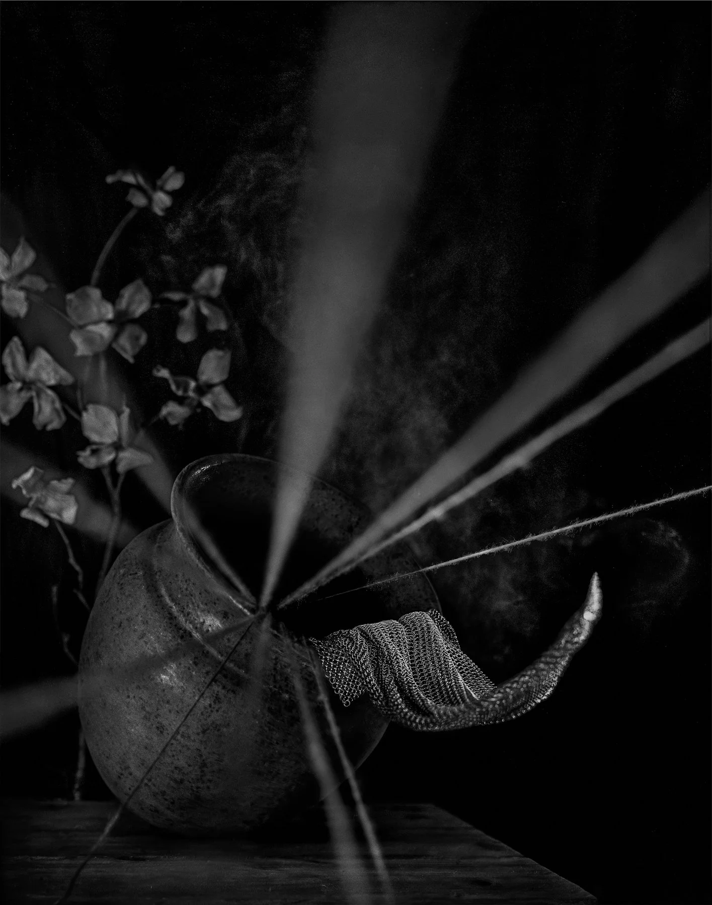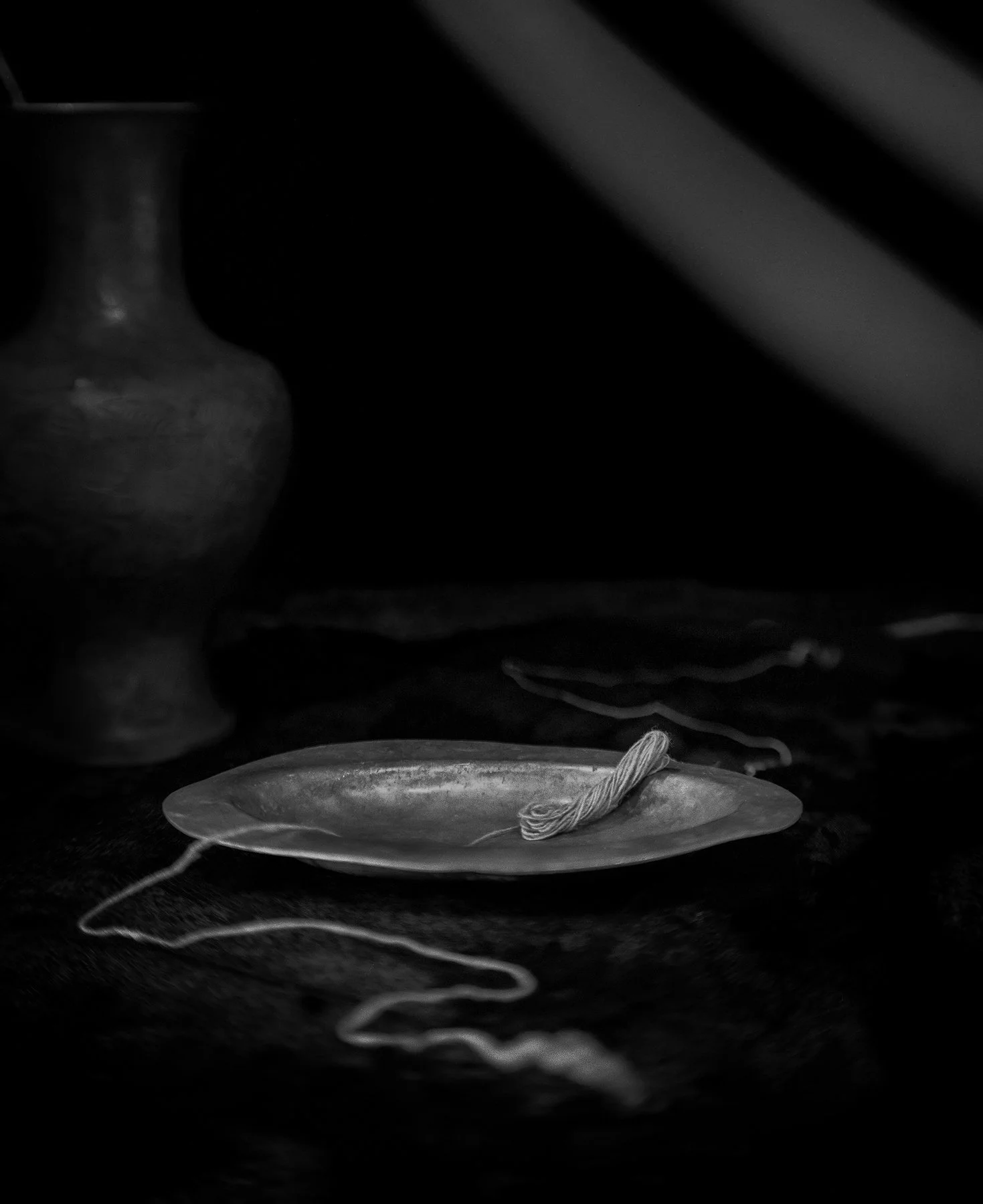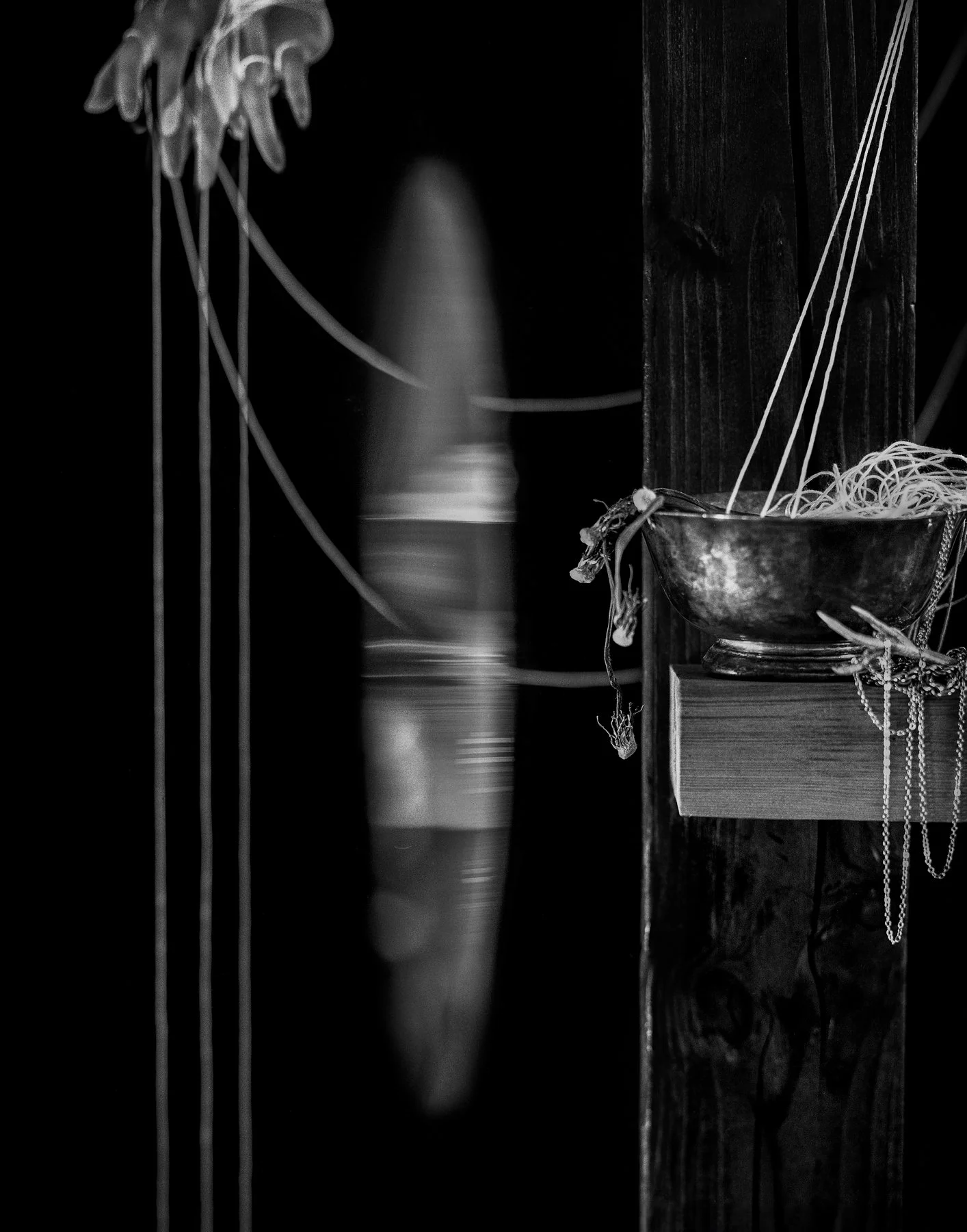 They are objects capable of holding history and contradiction—found, forgotten, and lost: a bundle of twine handmade of rose stem fibers and dog fur, an abandoned silver tray half buried in the woods, a brass urn with traces of ash, glass, stone, wood, bone, a bit of lace from who knows where. Elemental, organic, and fluid in time and significance. They touch on hegemonic value systems embodied in easy associations, but resist oversimplification. They become characters with their own bodies, memories, and complexities that can’t be reduced to easy generalizations.