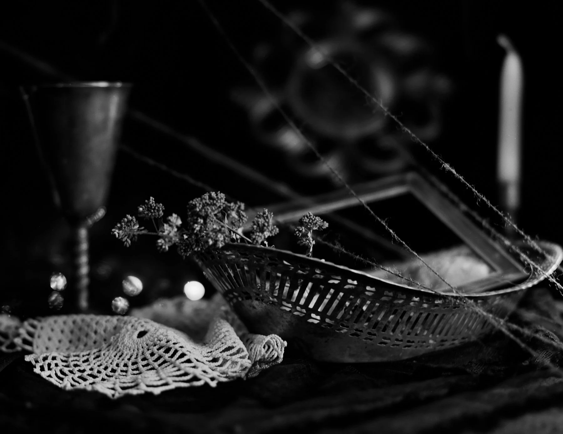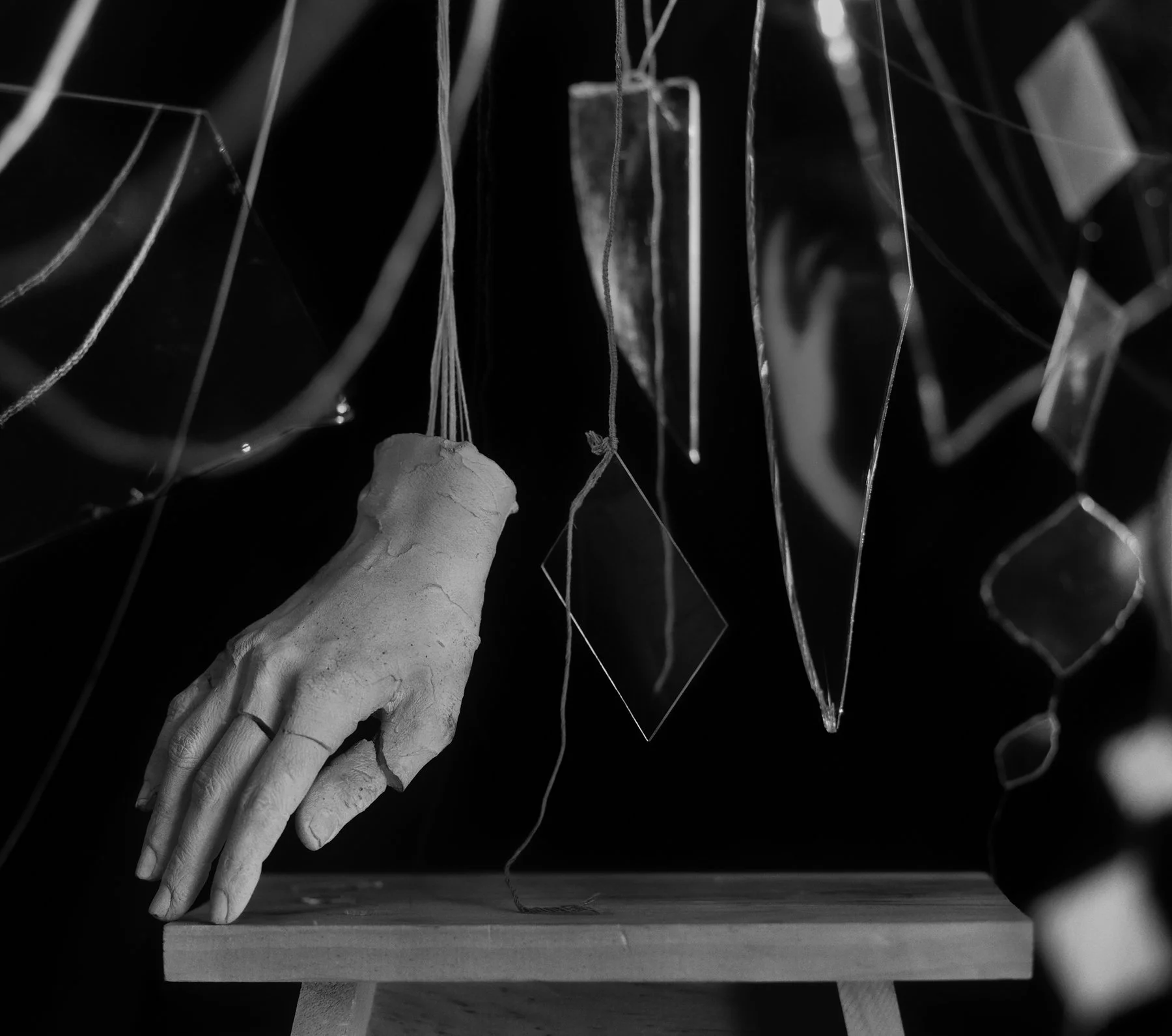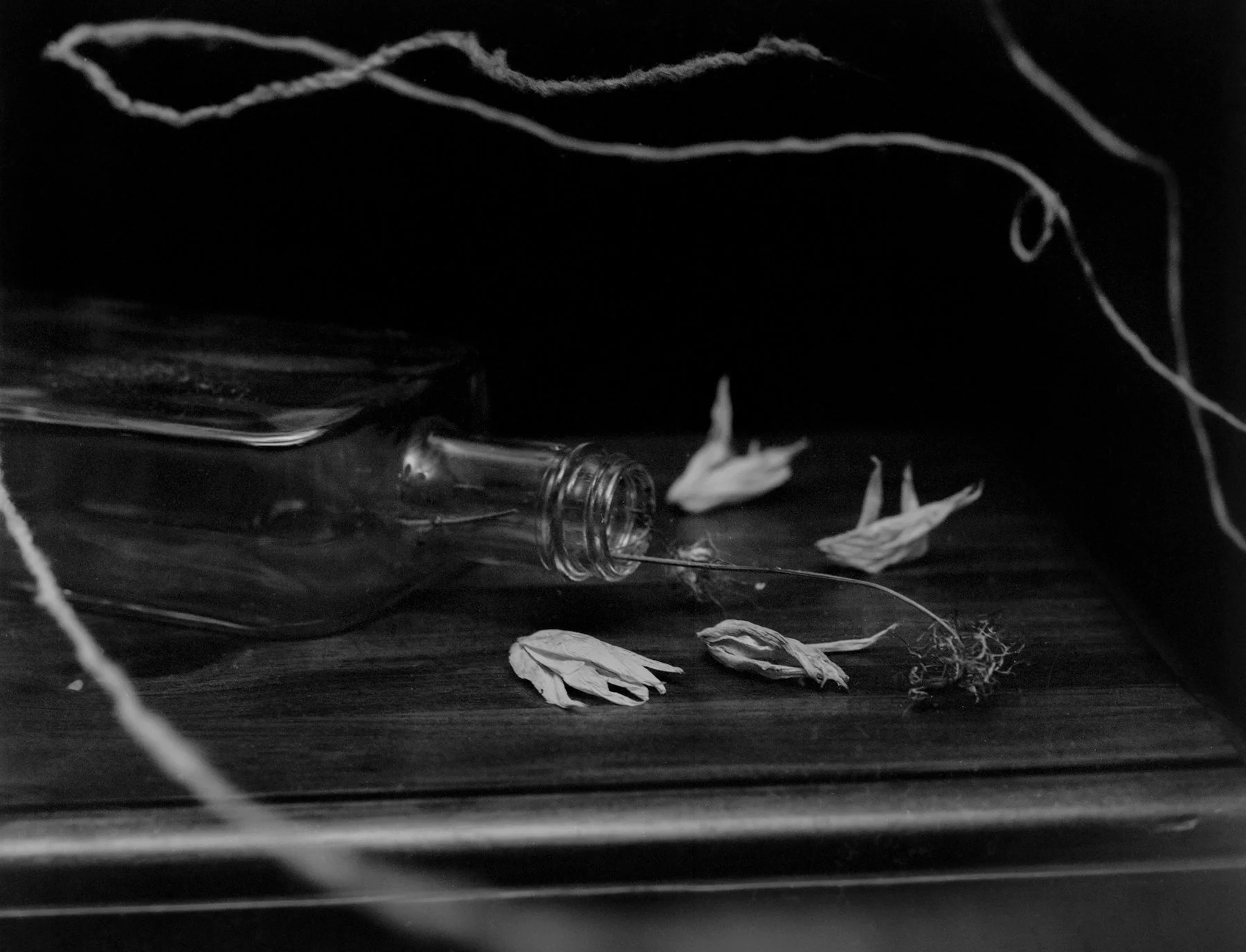 Through arrangements of natural and constructed materials—flowers, mirrors, string, bone, pigment—I consider how stories unravel and reform across bodies, materials, and time. Like elements with multiple valences, objects and symbols combine differently with each viewer's experience, creating meaning that is contingent—shaped by context, memory, and proximity.